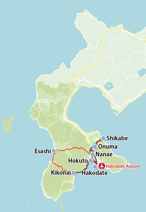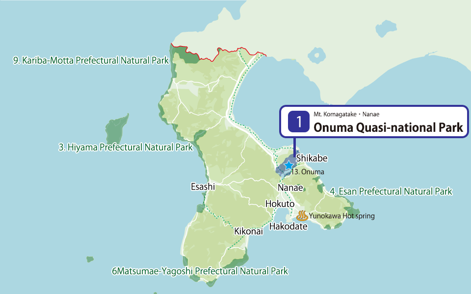 Hiyama Prefectural Natural ParkKamome Island, Mt. Iou, Cape Tatenomisaki, Unsekikyo, Nagaiso Coast, Okushiri IslandEsan Prefectural Natural ParkMt. Esan, Cape Shiokubi, Cape Hiura, Esan Azalea Park, Mizunashi Kaihin OnsenMatsumae-Yagoshi Prefectural Natural ParkCape Shirakami, Iwabe / Kotaniishi Coast, Oritohama, Shiriuchi OnsenKariba-Motta Prefectural Natural ParkKumamodori Gorge, Futoro Coast, Sanbonsugi, Mt. Rissho |