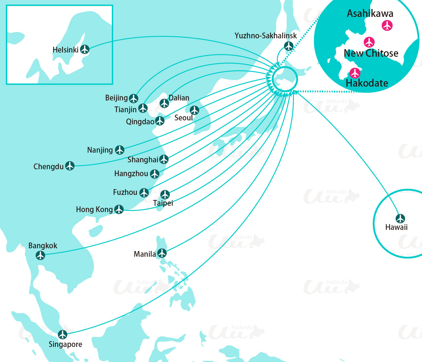 Yuzhno-Sakhalinsk, Seoul, Busan, Beijing, Tianjin, Nanjing, Shanghai, Qingdao, Chengdu, Fuzhou, Taipei, Kaohsiung, Hong Kong, Bangkok, Manila, Singapore