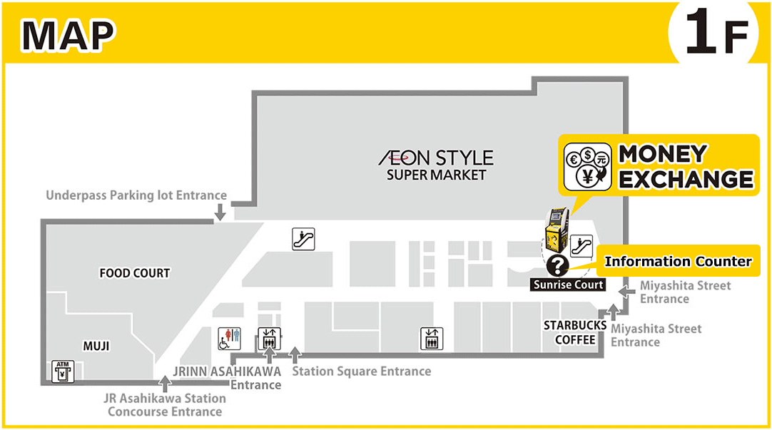 AEON MALL Asahikawa Station is convenient being directly connected to Asahikawa Station.The bus terminal is just in front, with buses heading to various areas including the Asahiyama Zoo, Asahi-dake, Asahikawa Airport, and Sapporo area, the Kamikawa, and Kitami area, and the Biei and Furano area. This is the main converging point of transportation, and it's convenient for shopping and dining. In addition, there are AEON Bank ATMs (you can get cash out), and foreign currency exchange machines making it convenient. Inside you can use free Wi-Fi. ALIPAY & WeChat Pay accepted (in some stores). Union Pay cards, and various credit cards are accepted. It is a duty-free store for consumption tax. AEON is convenient with its array of goods necessary for travelling.