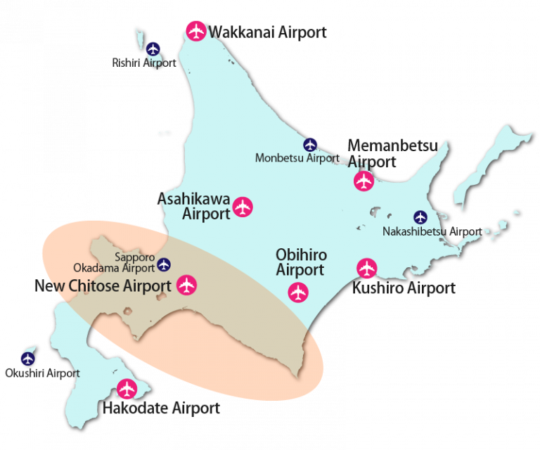 New Chitose Airport | Okadama Airport | Asahikawa Airport | Hakodate Airport | Okushiri Airport | Memanbetsu Airport | Monbetsu Airport | Kushiro Airport | Nakashibetsu Airport | Obihiro Airport | Wakkanai Airport | Rishiri Airport
