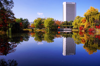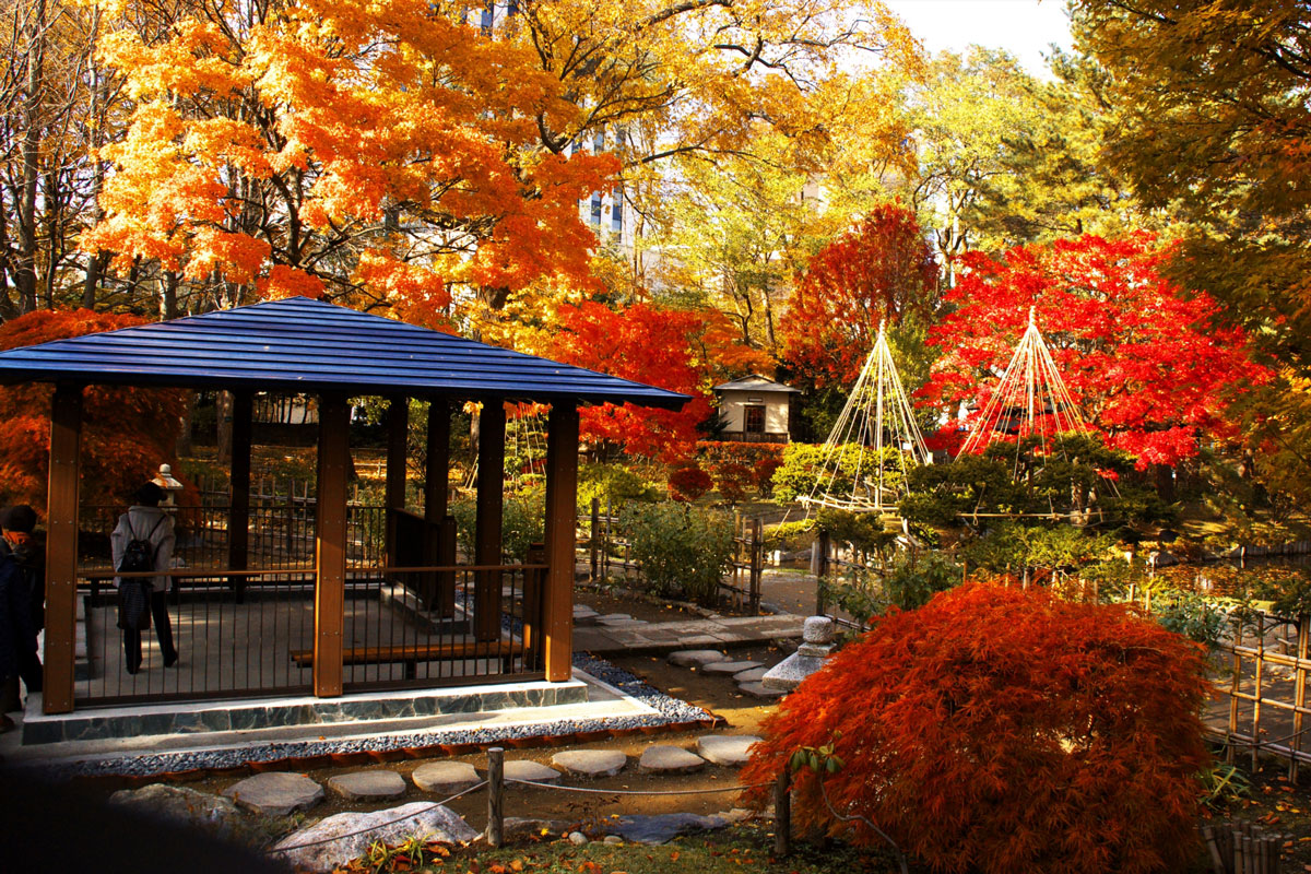 Please check out Nakajima Park walking MAP. Leave the Nakajima Park Subway Station and enter the park. Around Ayame Pond, there are many famous landmarks, including ① Hassouan Tea Room, ② Toyohirakan, Observatory, Kitara, Hokkaido Museum of Literature, Kamokamo River, Nakajima Sports Center, Yahiko Shrine, and Gokoku Shrine, before proceeding to Horohira-bashi Subway Station. The park's stunning autumun colours will make you want to take lots of photos. You can also take pictures from the restaurants on the upper floors of nearby high-rise hotels.