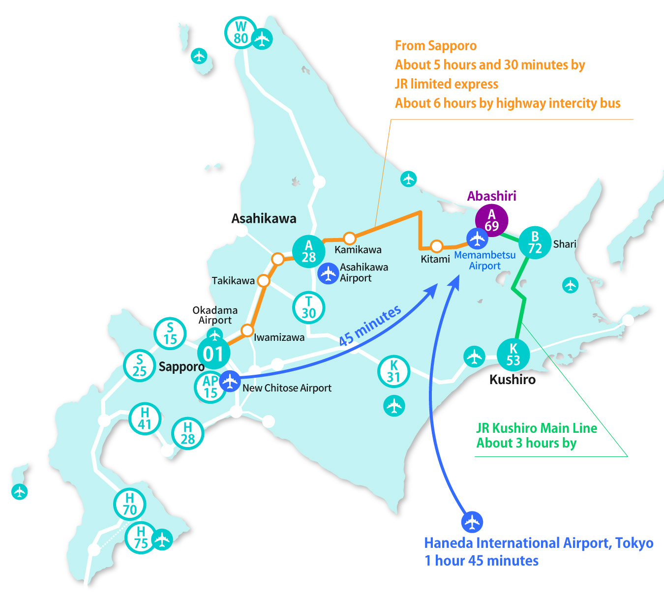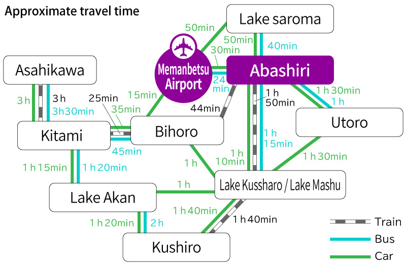5 round trip flights a day from Tokyo Haneda Airport to Memanbetsu Airport approximately 1 hour 45 minutes, then regular bus approximately 30 minutes.