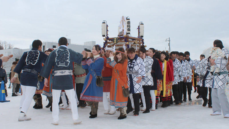 Festival where the local people gather and enjoy Abashiri’s summer together. Shopping street becomes pedestrian’s paradise during the festival. Ryuhyo (iceberg) dancing in which 1,000 people dance together and the fireworks are beyond a doubt the best part. The Okhotsk sea is covered by fireworks.