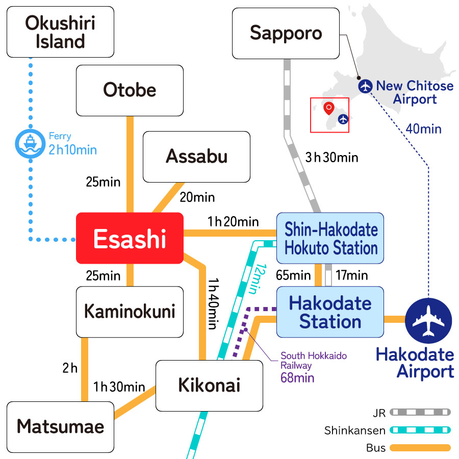 Take the Shinkansen from Tokyo Station to Shin Hakodate Hokuto Station (about 4 hr. 16 min.) - Transfer to a bus to Esashi Town (About 80 min.)
