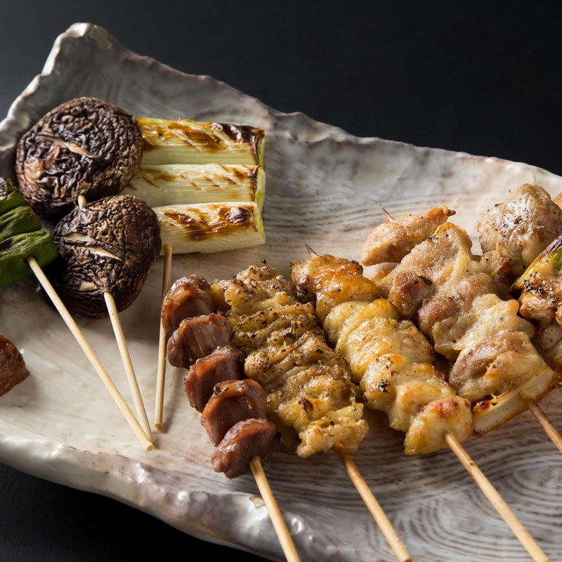 9 kinds of chicken skewers, pork skewers and vegetable skewers with special miso