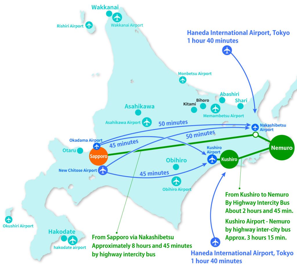 About 2 hours 40 minutes by “Tokkyu Nemuro Gou” from Kushiro Ekimae Bus Terminal
