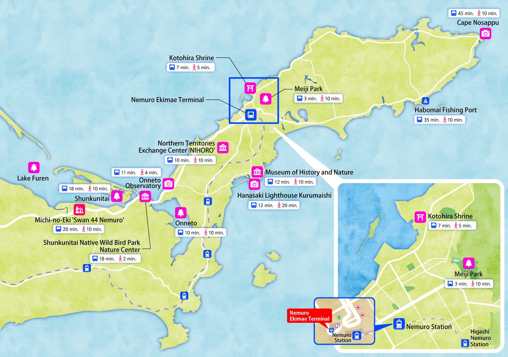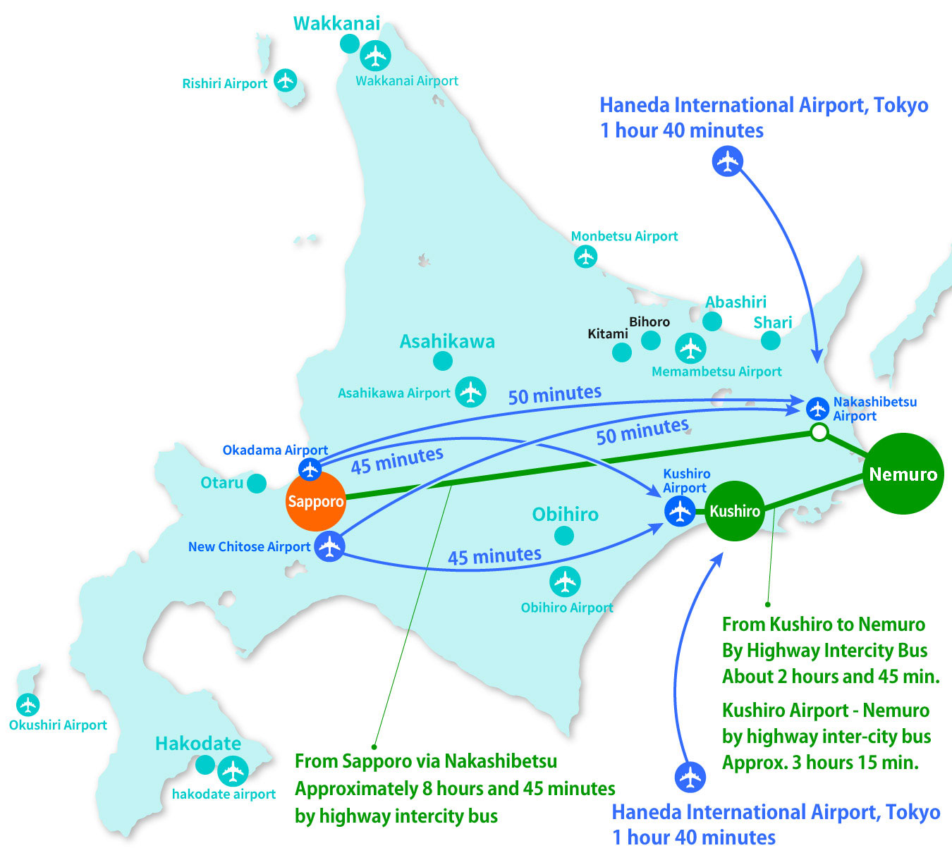 For getting around and finding scenic spots within Nemuro city, you can make use of Nemuro Kotsu buses as well as chartered buses. We operate round trip buses from Sapporo city, Kushiro city, Nakashibetsu airport and Kushiro airport (limited period) to Nemuro city.