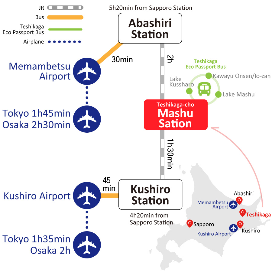 From Memanbetsu Airport, take the bus to the Abashiri Bus Terminal and get off at JR Abashiri Station (about 30 minutes). From JR Abashiri Station, take the train to JR Mashu Station on the "Kushiro-bound" line (about 2 hours).