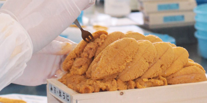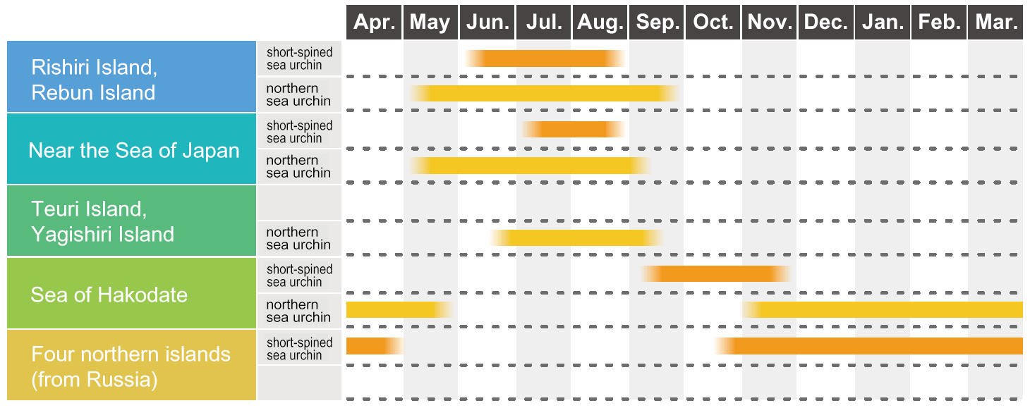 Since there are kelps in the coast of Hokkaido, fishing for nutritious natural sea urchins is thriving. In order to protect sea urchin as precious marine resource, fishing seasons and time are controlled.