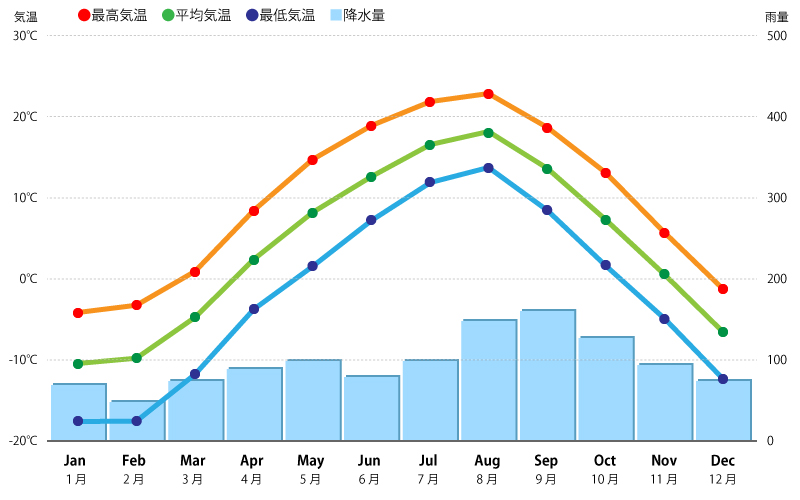 Average temperature (℃) | -10.5 | -9.9 | -4.8 | 2.2 | 8.1 | 12.7 | 16.5 | 18.0 | 13.4 | 7.2 | 0.4 | -6.5 |