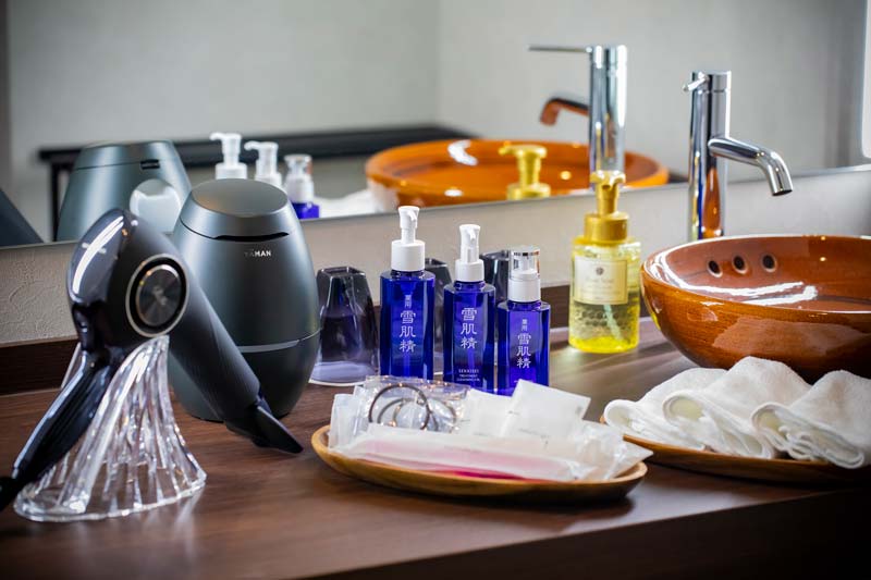 Guestrooms with open-air baths / Open-air baths / Large public baths / Western, Japanese, and Chinese cuisine / Original goods / Convention rooms / Healing salon / Swimming pool / Squash court / Arena / Fitness gym / Outdoor tennis court