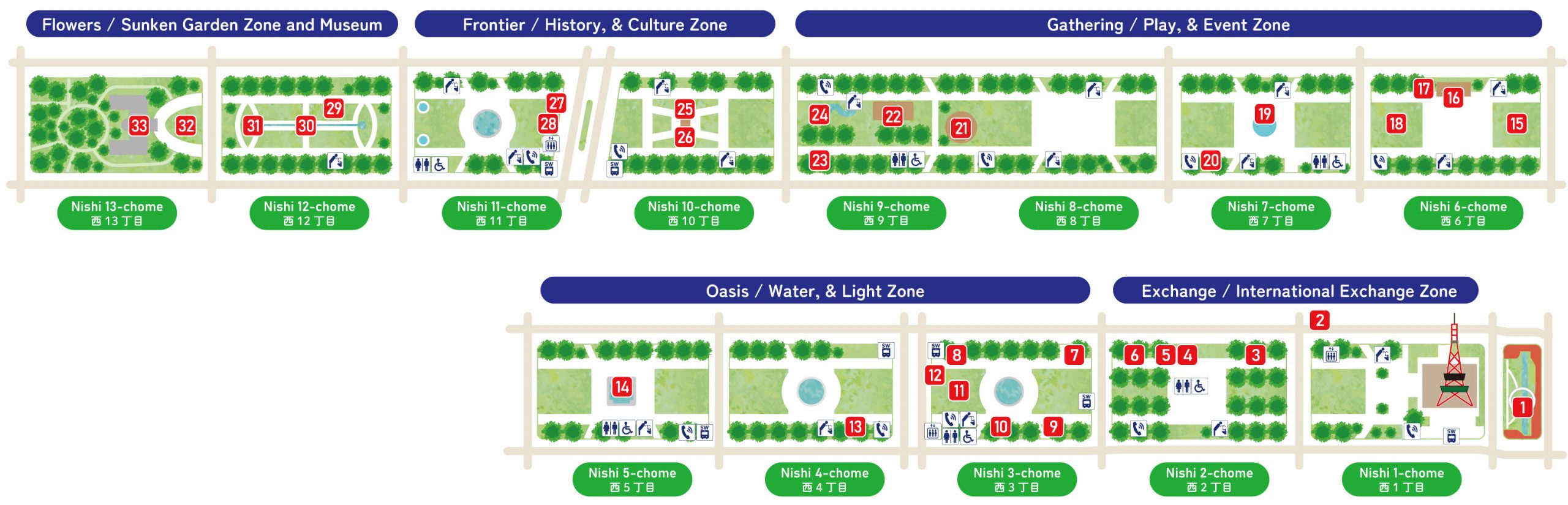 The course is about 1.6 km long from Odori Nishi 1-chome to Odori Nishi 13-chome, a distance of about 30 minutes, and takes about 2 hours at a leisurely pace, visiting monuments and resting at fountains and benches.