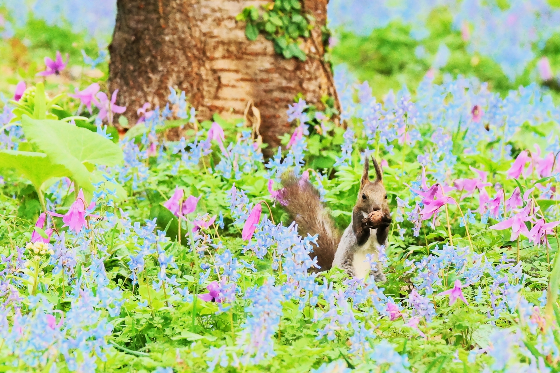 Corydalis ambigua and dogtooth violets spread out like a carpet all over the shrine grounds, and it is a popular hidden spot for photographing charming wild birds, squirrels and other wildlife.