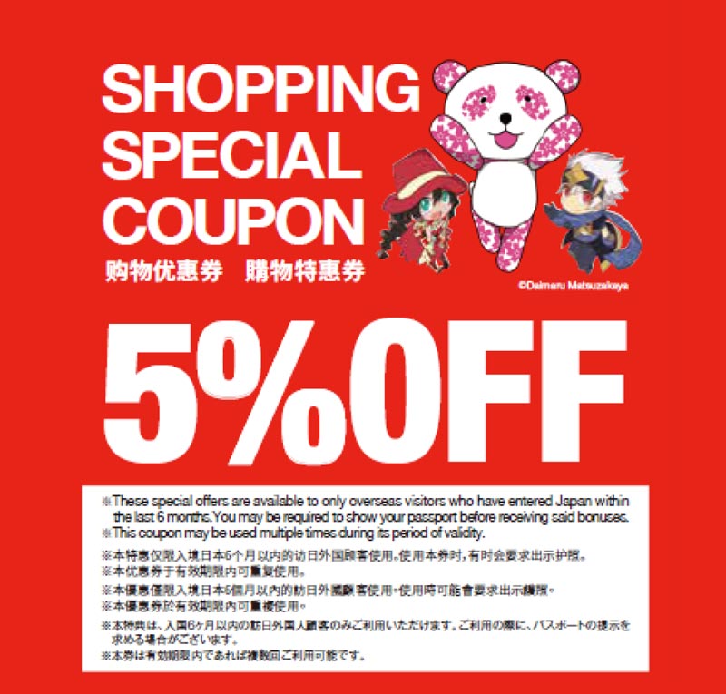 Foreign customers who have been in Japan for less than 6 months will receive a 5% off SHOPPING SPECIAL COUPON upon presentation of their passport. (Excluded brands: watches, luxury brands, etc.) Open until 8 PM for relaxed shopping.