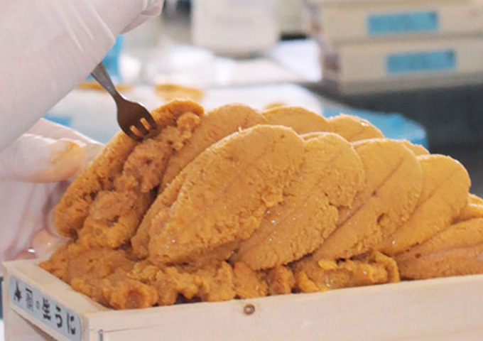 We kept challenging ourselves to processing manually without using additive such as alum, and finally succeeded in packing and shipping non-additive sea urchins.