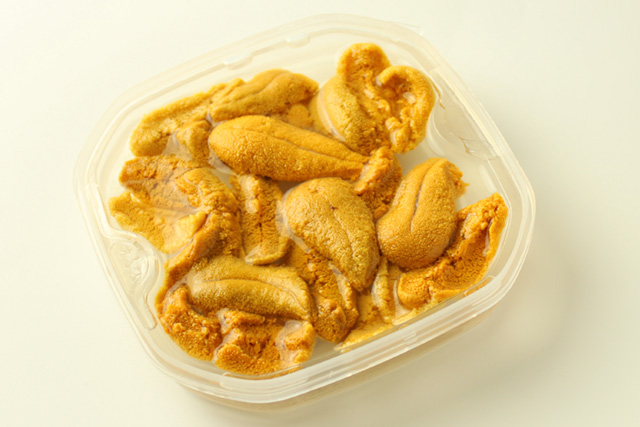 However, sea urchins are sensitive enough to start melting once you break the shell. Therefore, it is very hard to ship, preservative called alum is often used to prevent from melting. Alum prevents shape collapse, but loses the original melting texture and leaves the particular astringent taste on the tongue.
